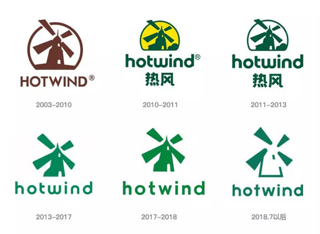 最新的LOGO继续保留了风车图形,但相比前面的五个版本,此次调整对图形的优化幅度最大。可以从下面的历史演变中看出,从2003年推出风车形象后,几次调整的过程均围绕此形象进行,其中2010年至2013年这段时间还增加了黄色的背景配色,风车的左右增加了一些装饰元素。